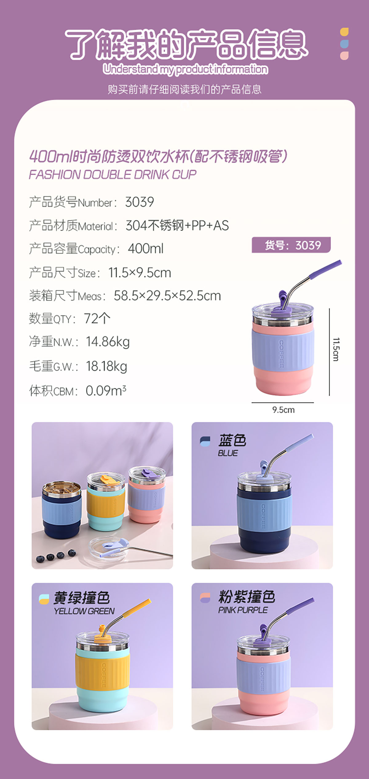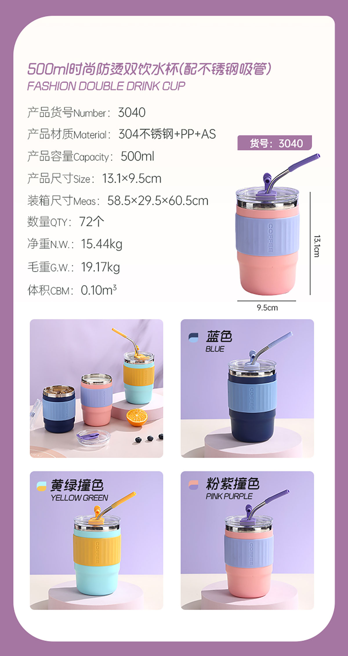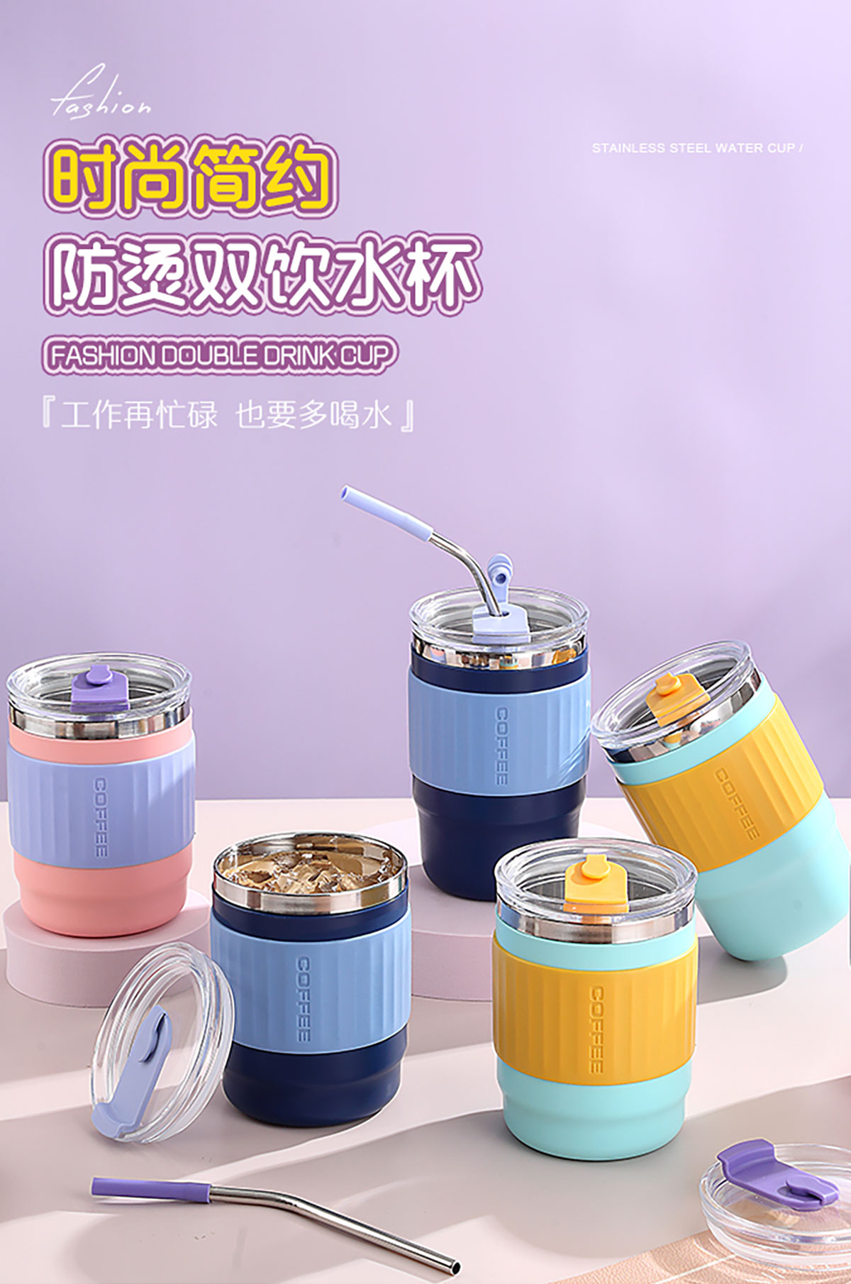 400ml/500ml時尚防燙雙飲水杯(配不銹鋼吸管)