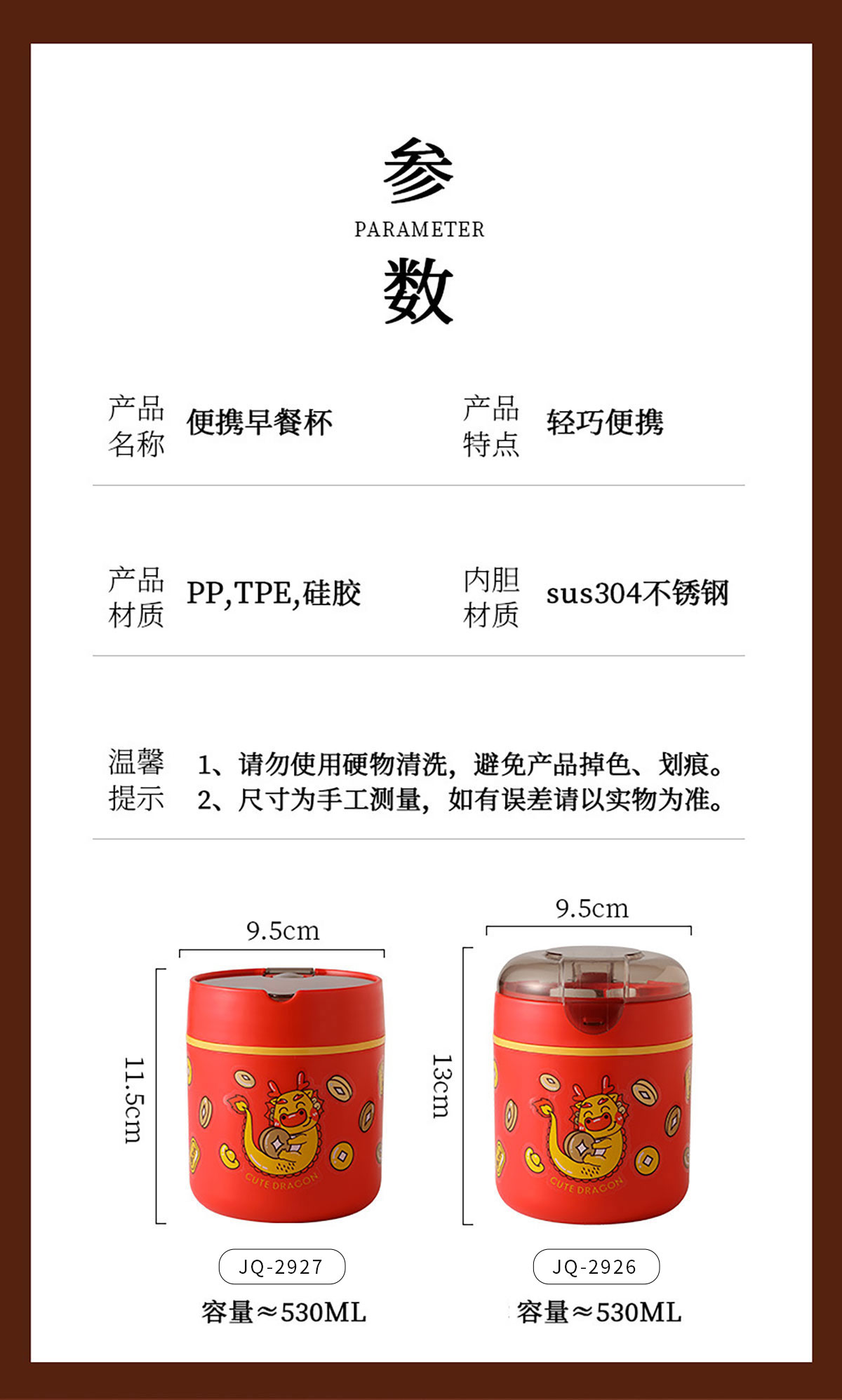 Size: JQ-2926(高蓋):95*130mm/530ml JQ-2927(平蓋):95*115mm/530ml