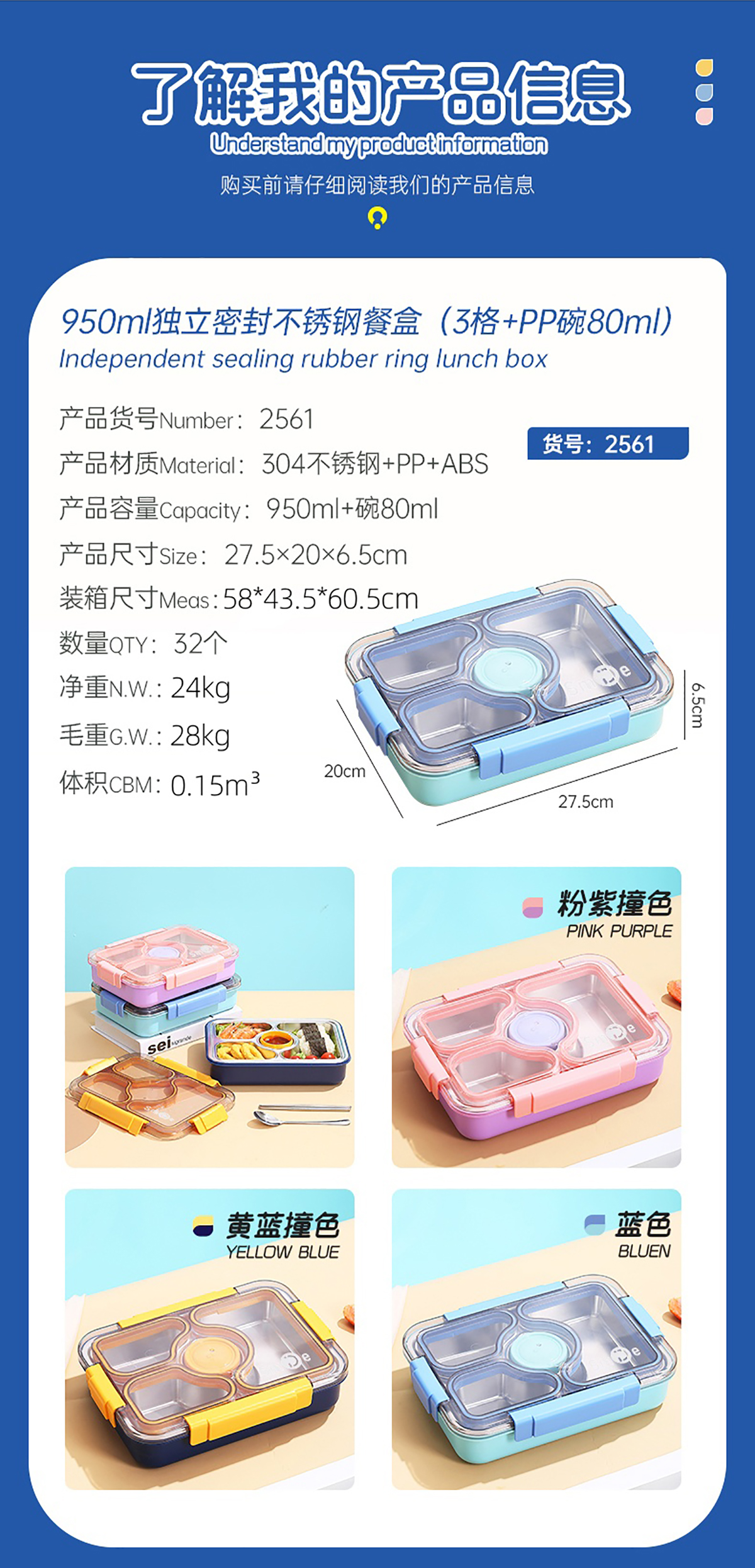 950ml獨(dú)立密封不銹鋼餐盒(3格+PP碗80ml+不銹鋼勺筷)