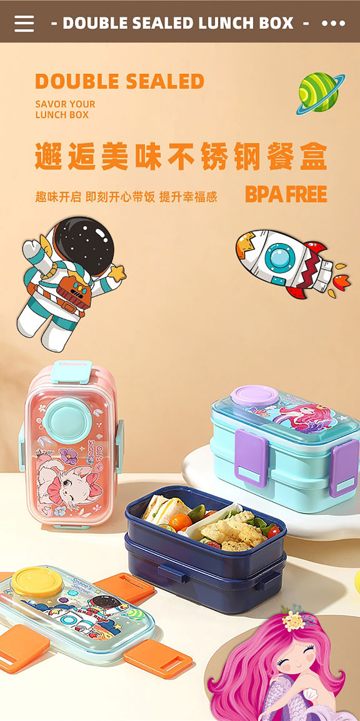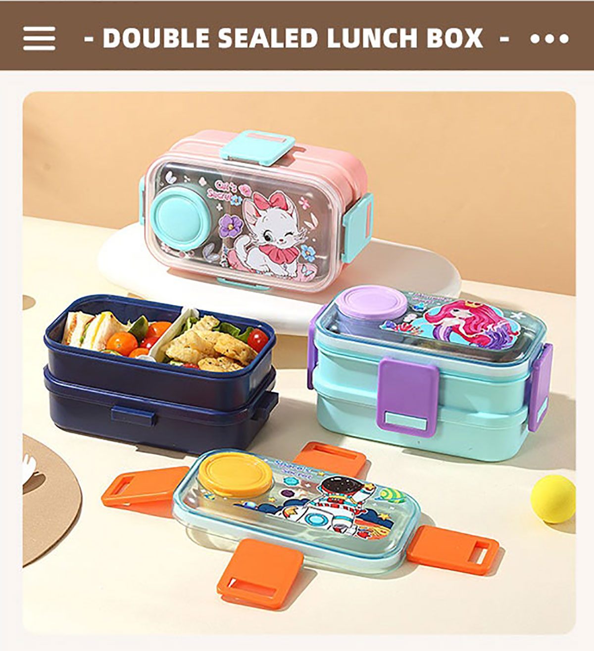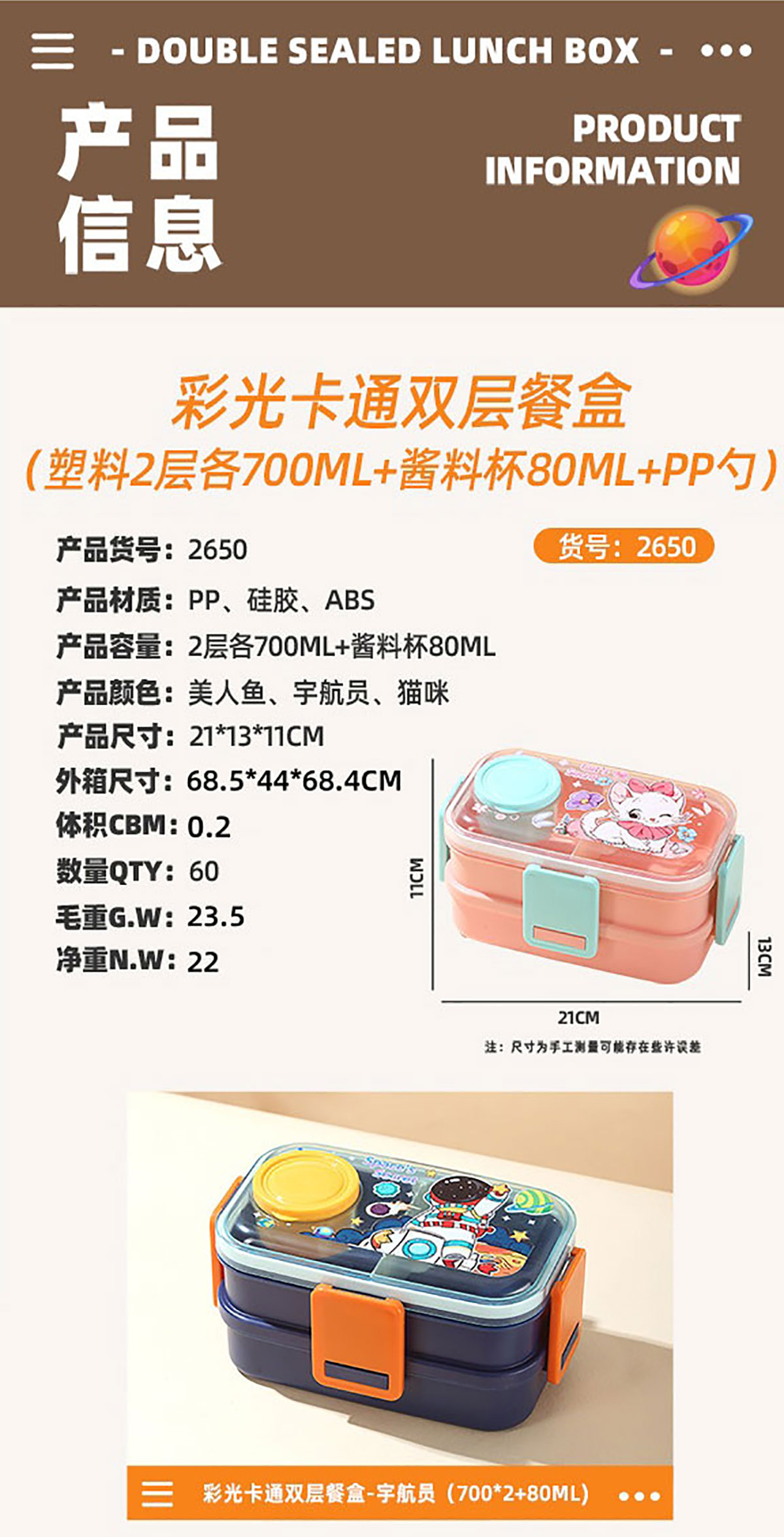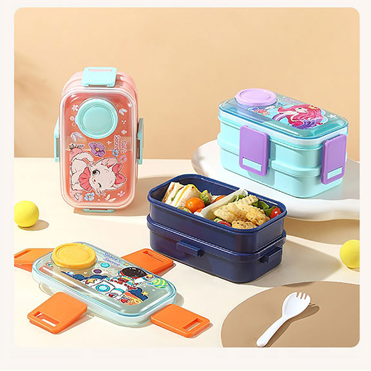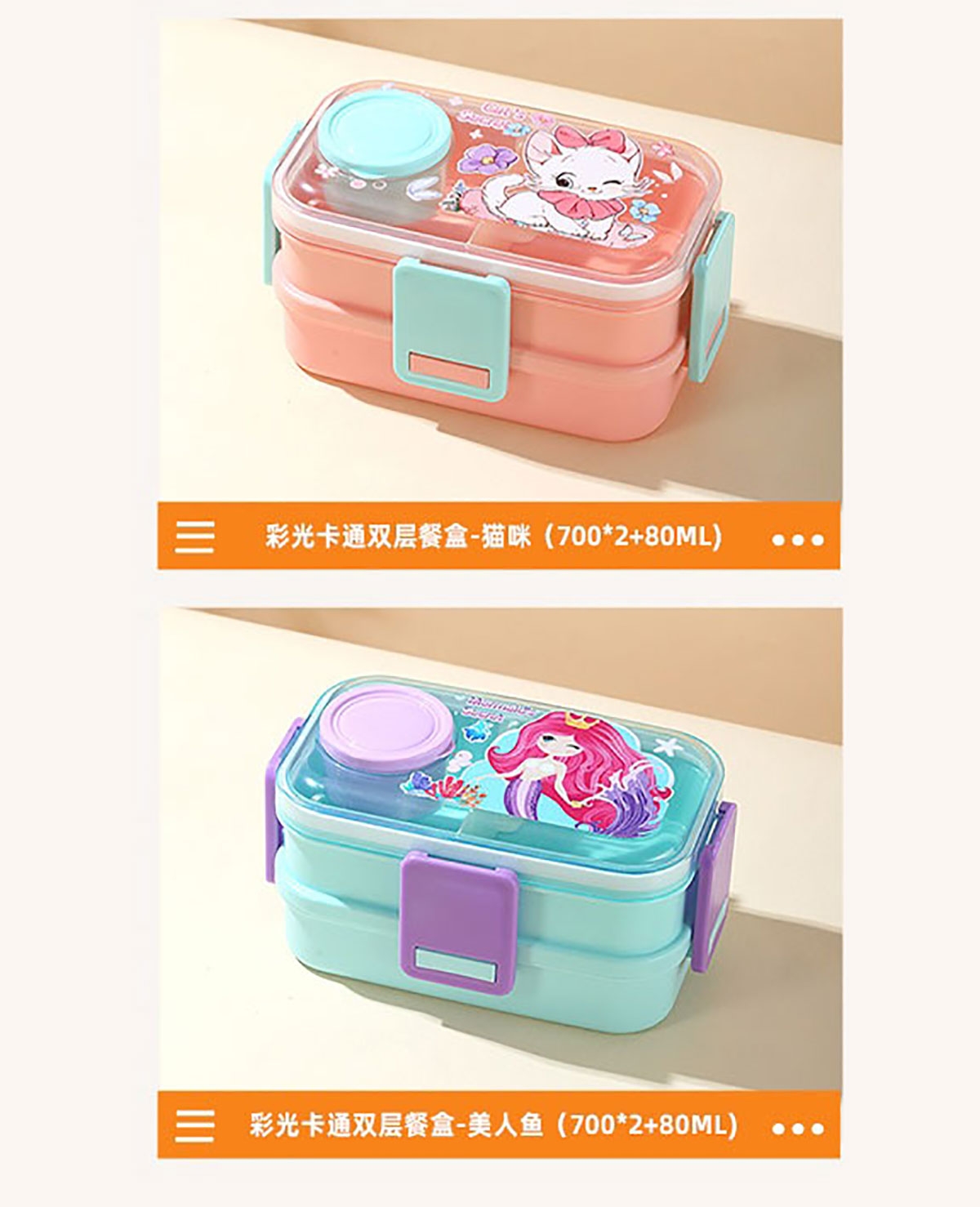 彩光卡通雙層餐盒(700mlx2+外置醬料杯80ml+pp勺)