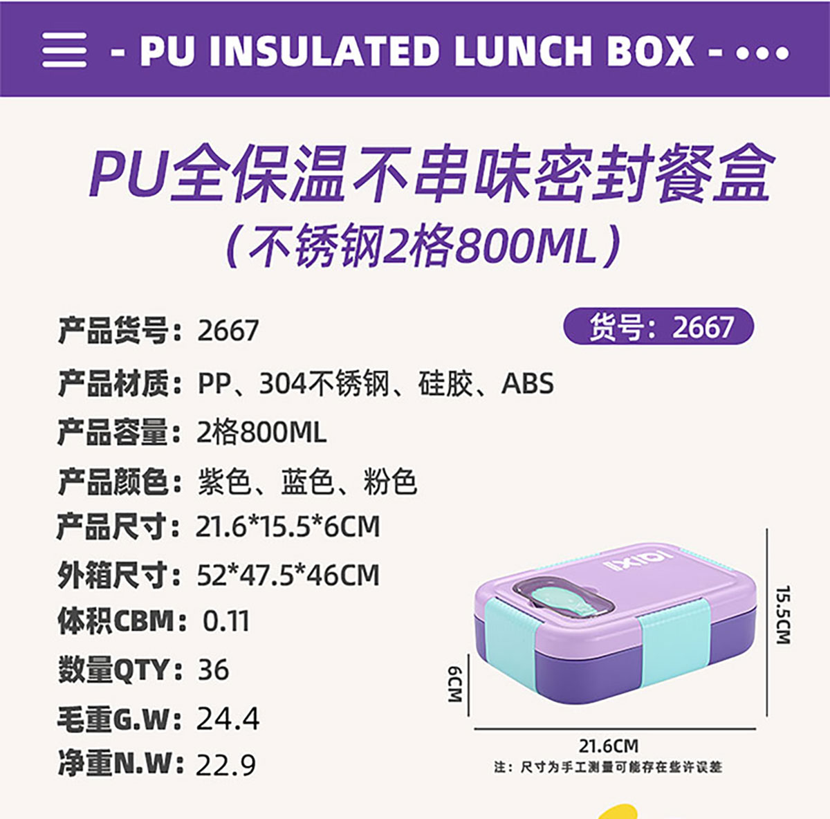 AQX-2667(2格):216*155*60mm/800ml