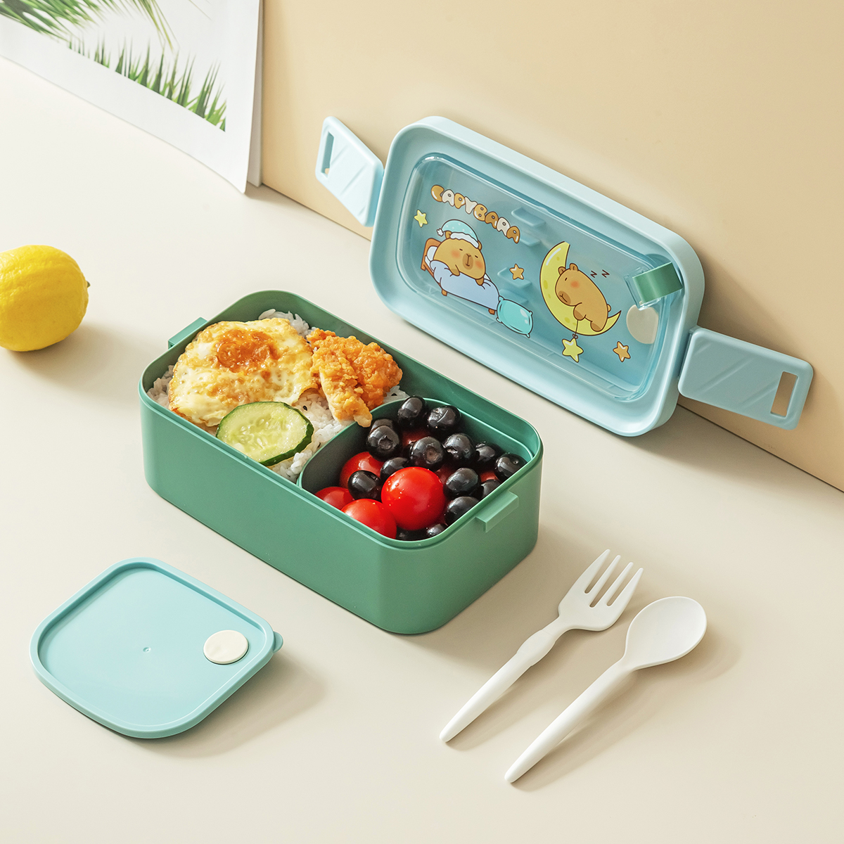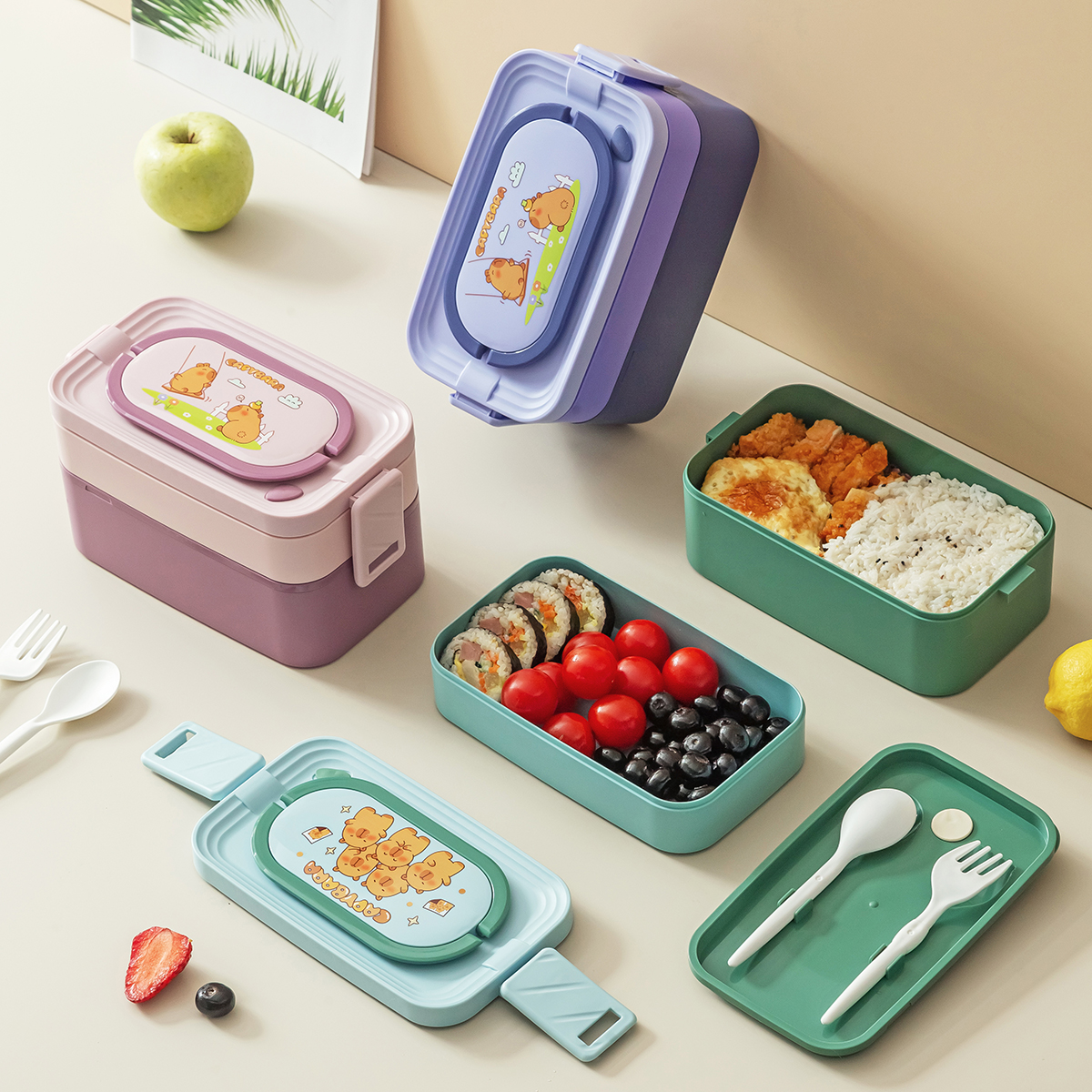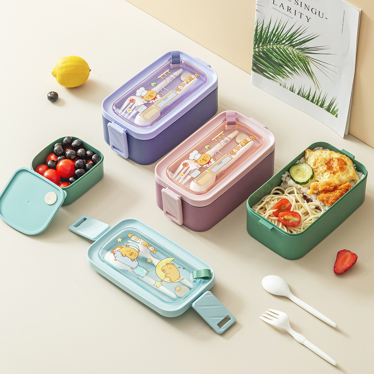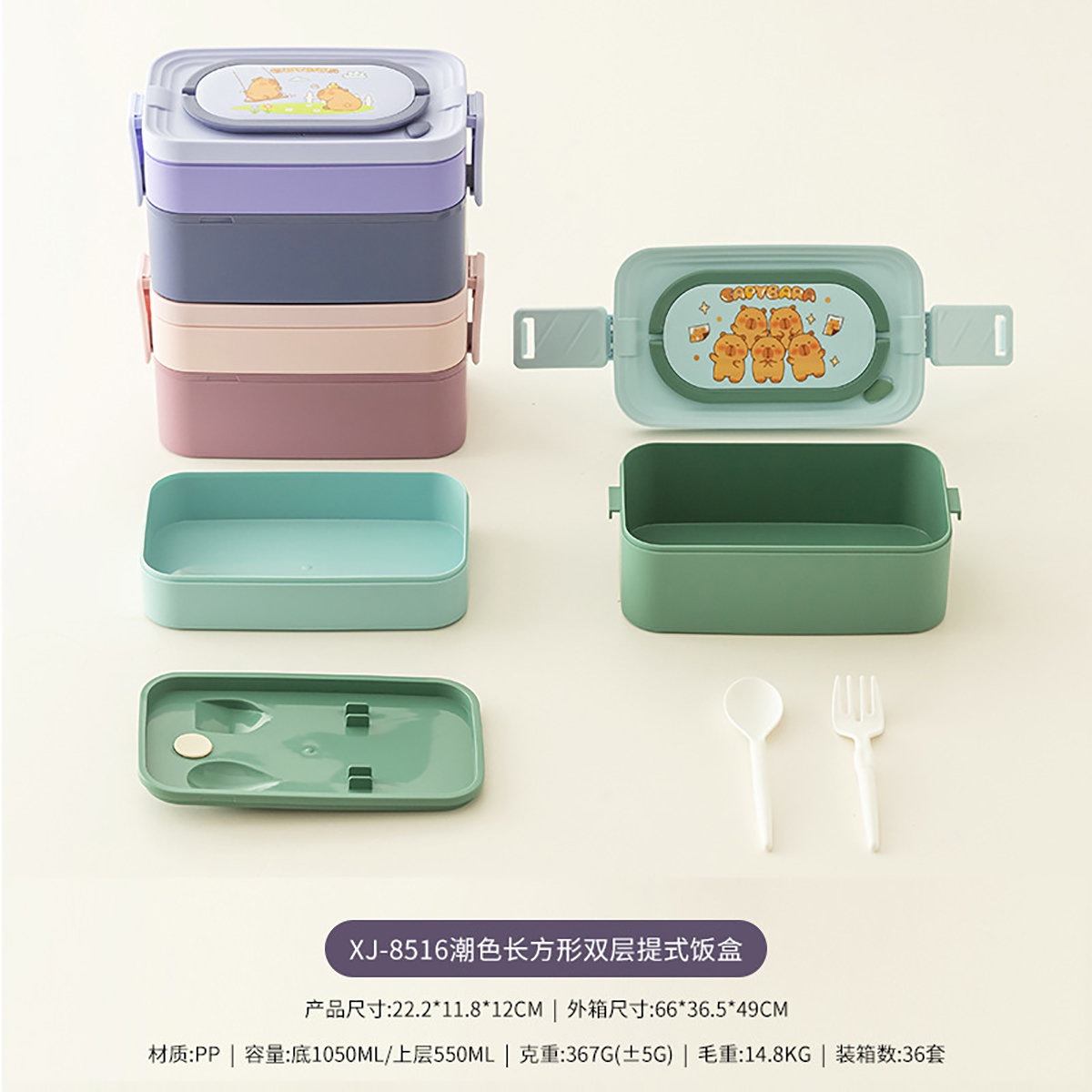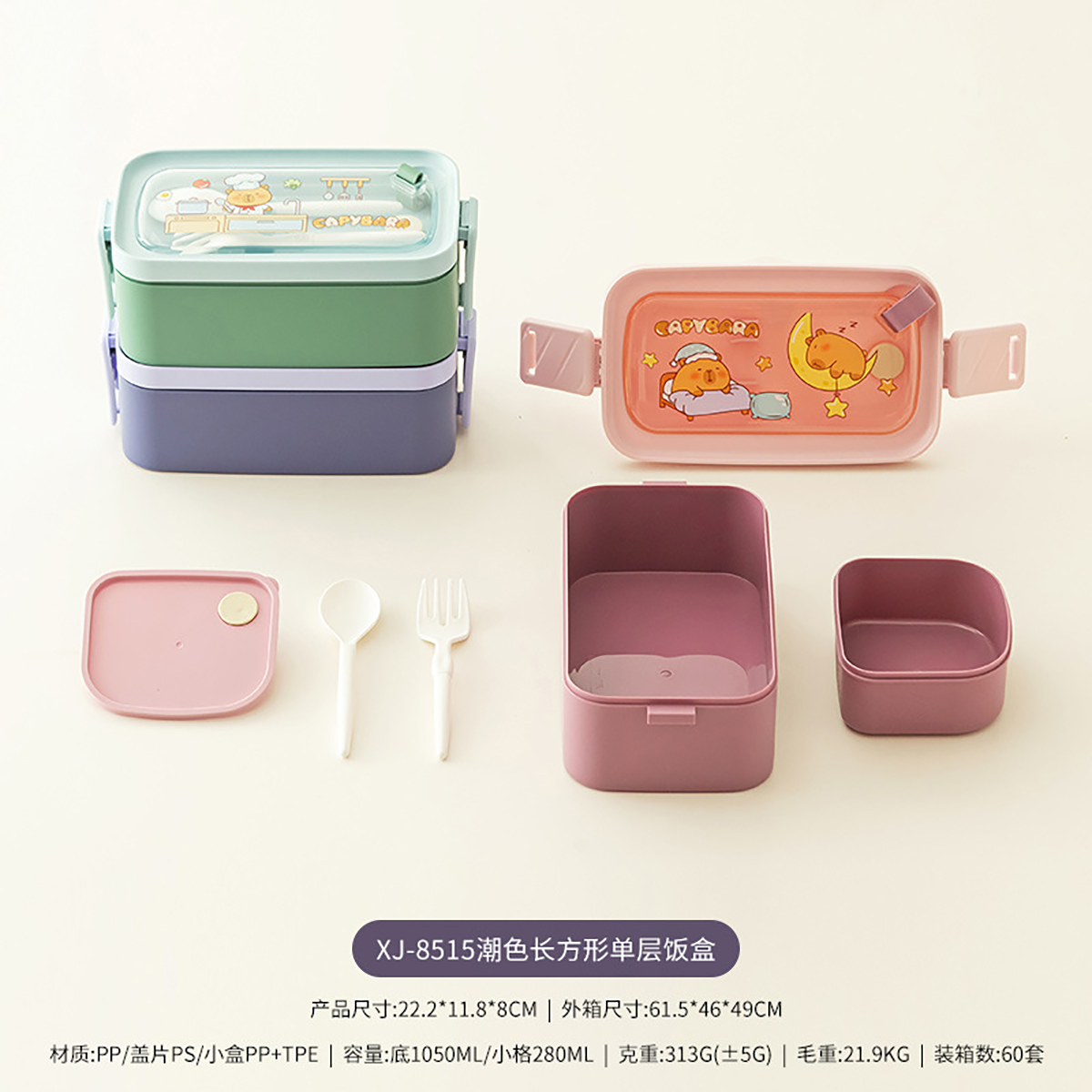 潮色長(zhǎng)方形單層/雙層提式飯盒
