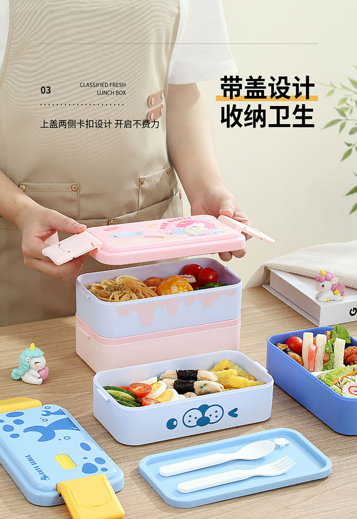 雙層伸縮扣密封飯盒卡通1600ml
